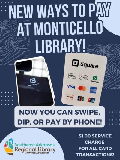 NEW AT MONTICELLO BRANCH LIBRARY! You can now swipe, dip, or pay by phone! We now accept CashApp, Apple Pay, Google Pay, JCB, and more! There is still a $1.00 service charge for all card transactions.