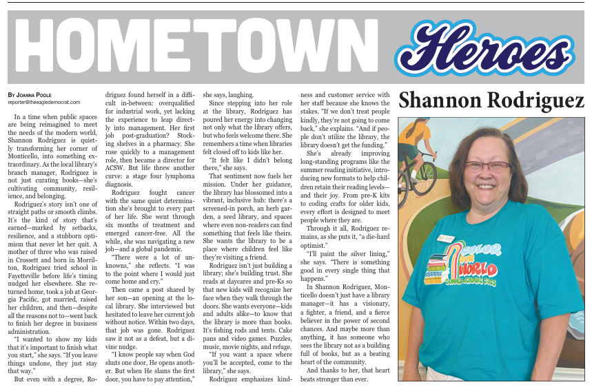 In a time when public spaces are being reimagined to meet the needs of the modern world, Shannon Rodriguez is quietly transforming her corner of Monticello into something extraordinary. As the local library’s branch manager, Rodriguez is not just curating books—she’s cultivating community, resilience, and belonging. Since stepping into her role at the library, Rodriguez has poured her energy into changing not only what the library offers, but who feels welcome there. She remembers a time when libraries felt closed off to kids like her. “It felt like I didn’t belong there,” she says. That sentiment now fuels her mission. Under her guidance, the library has blossomed into a vibrant, inclusive hub: there’s a screened-in porch, an herb garden, a seed library, and spaces where even non-readers can find something that feels like theirs. She wants the library to be a place where children feel like they’re visiting a friend. Rodriguez isn’t just building a library; she’s building trust. She reads at daycares and pre-Ks so that new kids will recognize her face when they walk through the doors. She wants everyone—kids and adults alike—to know that the library is more than books. It’s fishing rods and tents. Cake pans and video games. Puzzles, music, movie nights, and refuge. “If you want a space where you’ll be accepted, come to the library,” she says. Rodriguez emphasizes kindness and customer service with her staff because she knows the stakes. “If we don’t treat people kindly, they’re not going to come back,” she explains. “And if people don’t utilize the library, the library doesn’t get the funding.” She’s already improving long-standing programs like the summer reading initiative, introducing new formats to help children retain their reading levels— and their joy. From pre-K kits to coding crafts for older kids, every effort is designed to meet people where they are. Through it all, Rodriguez remains, as she puts it, “a die-hard optimist.” “I’ll paint the silver lining,” she says. “There is something good in every single thing that happens.” In Shannon Rodriguez, Monticello doesn’t just have a library manager—it has a visionary, a fighter, a friend, and a fierce believer in the power of second chances. And maybe more than anything, it has someone who sees the library not as a building full of books, but as a beating heart of the community. And thanks to her, that heart beats stronger than ever.