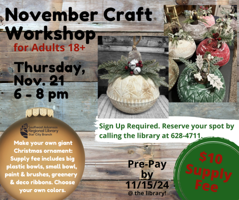 Come make your own giant Christmas ornament with us! Supply fee includes big plastic bowls, small bowl, paint & brushes, greenery and deco ribbons. You can choose your own colors.