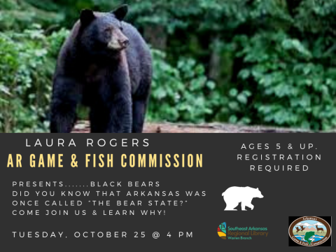 Did you know that Arkansas was once called “The Bear State?” Come join us & learn why! Ms. Laura Rogers from the Arkansas Game & Fish Commission will teach you lots of facts about these beautiful animals!