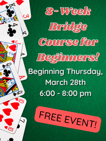 This is an 8 week class to instruct beginners on how to play the timeless game of "Bridge". Join us for the creation of this new community in our area. Each session will be 2 hours. Times will be posted closer to the March 28th beginning date.