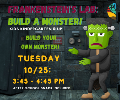Kids in Kindergarten and upper grades are invited to enter Frankenstein's Lab: Build a monster, using all kind of different materials present in Frankenstein's chamber. Design your monster... will it be a friendly creature? Or scary and dangerous?