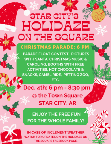 The Christmas Parade starts at 6 pm. Afterwards, join us at our library tent at the Star City town square on December 4th, 6-8:30 pm. Let's try out our brand-new "Library Wheel of Fortune" and win some prizes! Enjoy all the business booths, games, camel and carriage rides, a petting zoo, and other attractions - completely free!