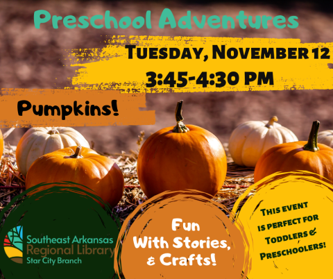 Join us with your toddlers & preschoolers for an afternoon learning about pumpkins at the library on Tuesday, November 12th, 3:45-4:30 pm. We'll have a snack and a story presented by Ms. Melissa. She's lots of fun and we are so excited to celebrate together.