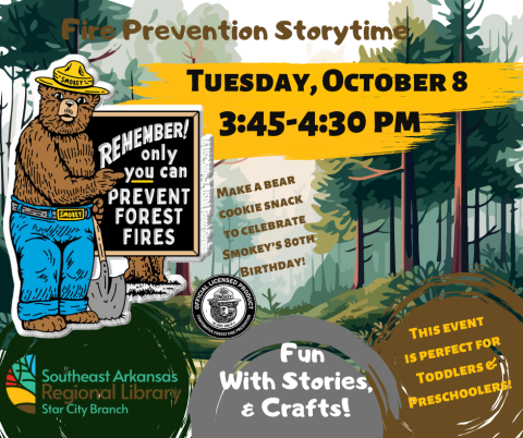Join us with your toddlers & preschoolers for an afternoon learning about fire prevention at the library on Tuesday, October 8, 3:45-4:30 pm. We'll make a bear cookie snack celebrating Smokey the Bear's 80th birthday and hear a story presented by Ms. Melissa. She's lots of fun and we are so excited to celebrate together.