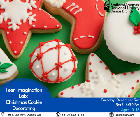 Teen Imagination Lab: If you can dream it, you can build it! Join us for the Library's December Teen Imagination Lab! This month, teens asked if they could decorate cookies, so here we go. Teens will decorate a variety of Christmas/holiday themed cookies (with taste testing at the end).
